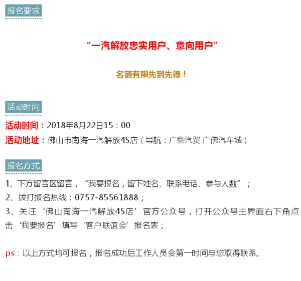 当前位置: 卡车之家 >卡车经销商 > 佛山市南海一汽汽车销售服务 > 促销新闻 > 8月22日15:00,南海一汽邀您来