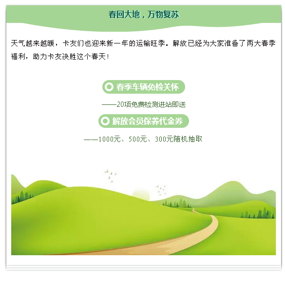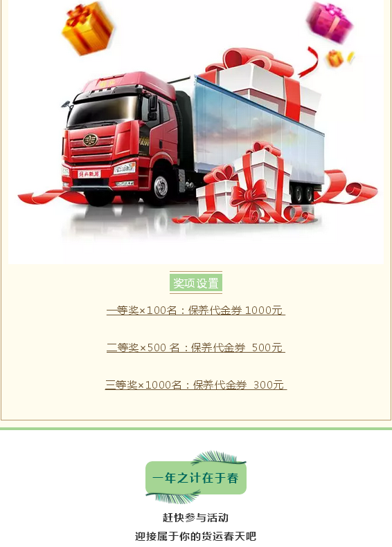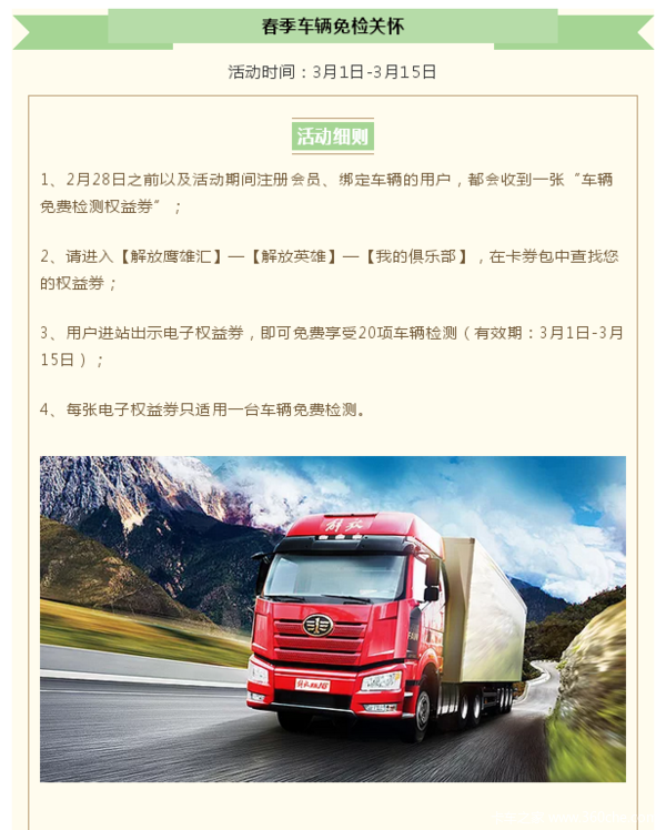 当前位置: 卡车之家 >卡车经销商 > 佛山市南海一汽汽车销售服务 > 促销新闻 > 春光灿烂赚大钱,先来解放领免检券、保养代金券!