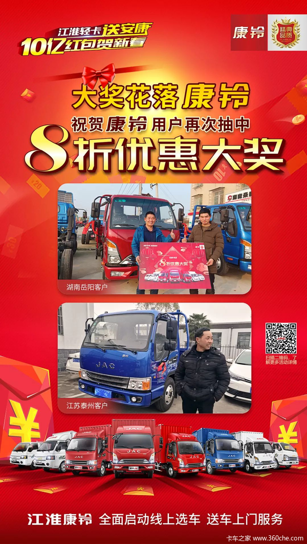2020年3月31日前,参与“江淮轻卡送安康,10亿红包贺新春”活动,送1000-5000元购车代金券,更有机会赢取精美礼品,凡成功购车还有7~9折优惠等您来拿,快点击“江淮轻卡”微信公众号菜单“十亿钜惠—十亿钜惠”参与进来吧!