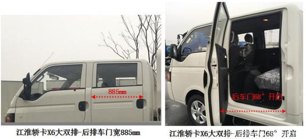 由于车辆公告车身总长不超度6米蓝牌限制,双排车型的载货空间往往比较一般,江淮轿卡双排座产品将空间做到了极致,驾驶室空间大、货箱容积大;江淮轿卡X6产品卓越的产品配置及人性化的涉及。
