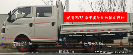 X6双排轴距3100mm,采用BMW平衡配比长轴距设计理念,踏步离地高度 340mm,上下便利;货台最低至748mm ,装卸货省力、快捷;货箱长度2970mm、2750mm,宽度1750mm,目前X6双排满足平板整车、仓栅、厢式上装状态,最大厢式车货箱容积高达10立方,同级别车型中处于领先位置;