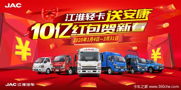 2019年,江淮轻卡销量突破20万辆,继续稳居中国中高端轻卡第一品牌。为了感恩新老客户的关注和支持,江淮轻卡于1月4日正式上线“江淮轻卡送安康10亿红包贺新春”活动,一系列购车福利超值来袭,近期有意向购车的卡友们千万不要错过啦!
