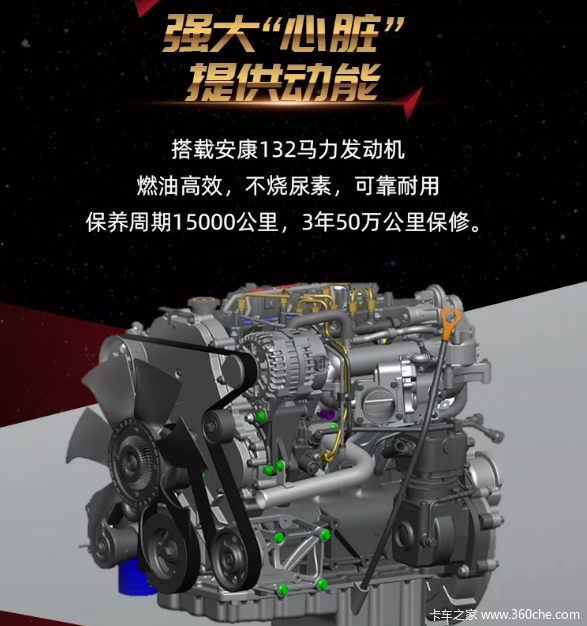 黄金动力组合:在动力方面,搭载两款发动机,一款是江淮锐捷特132马力发动机,燃油高效,不烧尿素,可靠耐用,买车即养车;一款是云内德威2.7L发动机,动力强劲,油耗低,性价比高;配备万里阳六档变速箱,多锥同步,快人一档,整车系统传动效率达90%以上。