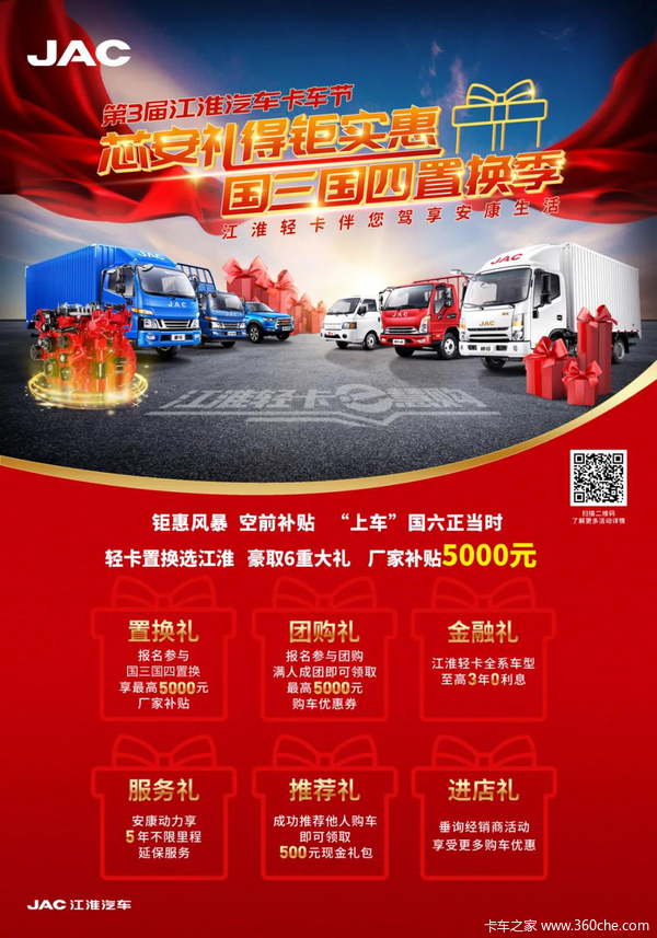金融礼:进行国三国四置换的卡友还可享受江淮轻卡超值金融礼包,全系车型至高3年0利息补贴,还可参与ipad、京东购物卡抽奖。