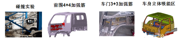 前围安装4 4加强筋,车门有3 3加强筋,车身设有立体吸能区,是同级别唯一高标准通过长春安全碰撞试验的轻卡;
