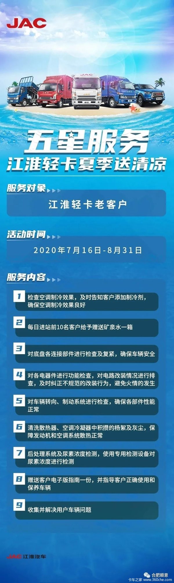 当前位置: 卡车之家 >卡车经销商 > 合肥市顺意汽车 > 促销新闻 > 江淮轻卡夏日送清凉,多重服务免费送!