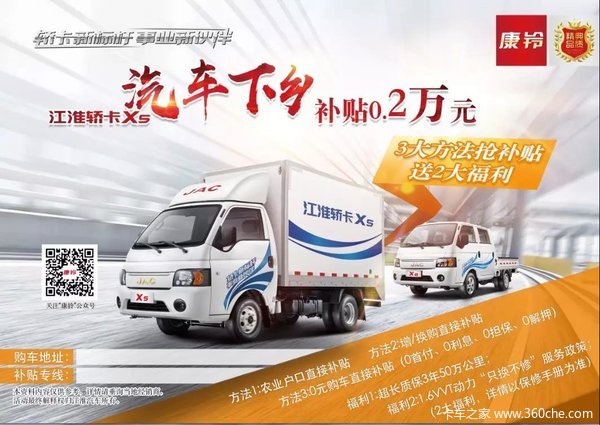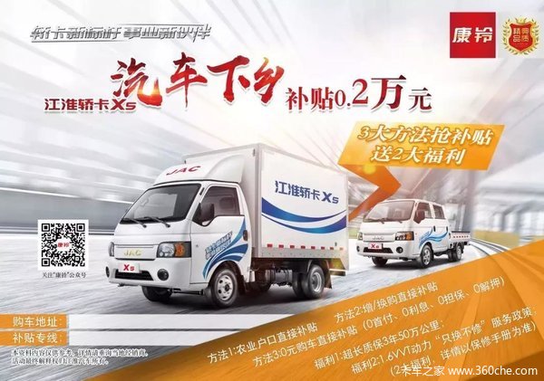 日前,江淮康铃正式公布汽车下乡补贴政策,用实际行动响应国家下乡政策。即日起,凡是农业户口购买江淮康铃3.5吨以下汽油机产品,一次性直接现金补贴0.2万元/台。