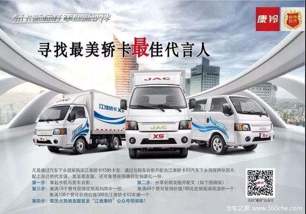 即日起,凡是通过汽车下乡政策购买江淮轿卡X5的卡友,更能参与康铃组织的寻找最美轿卡代言人活动,赢取高端希诺保温杯、定制精品车模等豪礼。