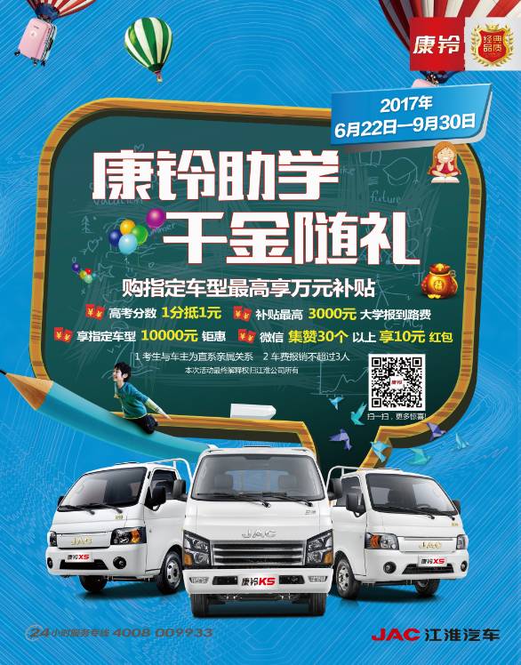 作为同城配送和区域物流专家,康铃一直以其过硬的品质和优质的服务赢得广大卡友的信赖,被赞誉为创业致富能手。服务不停,关怀不止——现在只要在助学季期间购买指定康铃轻卡,最高能享受万元助学补贴,还能开着康铃走上致富之路,简直就是两全其美啊!