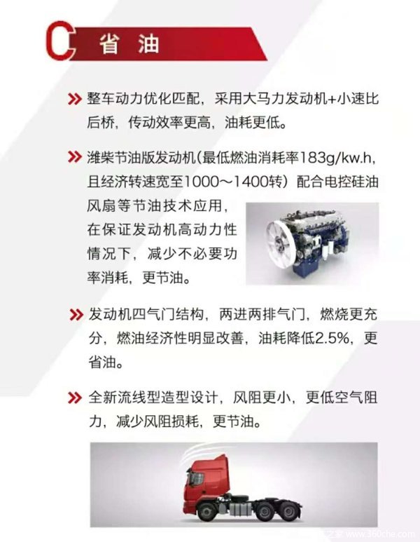 省油 高效燃烧节油,超高压燃油系统,树立行业新标准,更好地雾化燃油,燃烧更充分,更显著减排。整车动力优化匹配,采用大马力发动机+小速比后桥,传动效率更高,油耗更低。