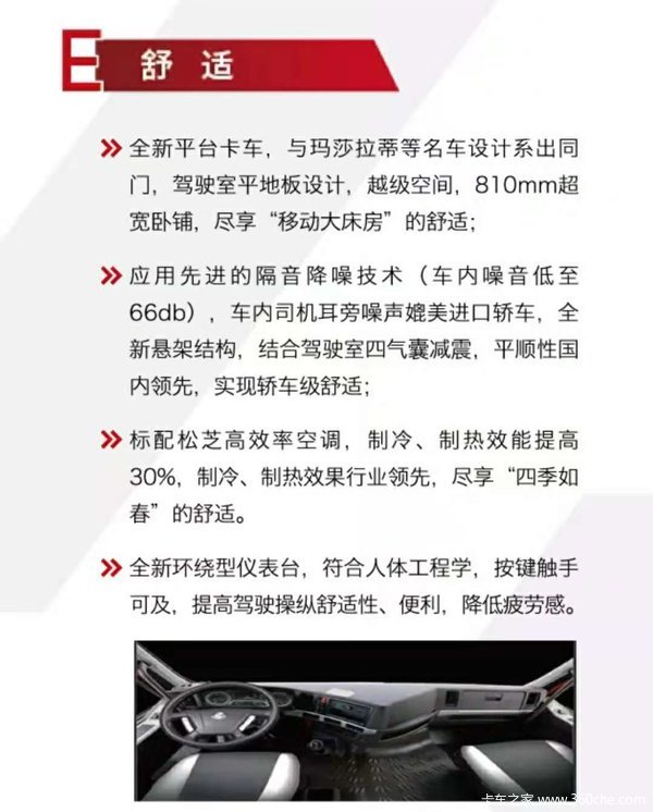 舒适 轿车级静音 豪华轿车技术打造的卡车,超低室内噪音,超轻便驾乘感受。 豪华级感受 思维气动调节高端气囊座椅、三段折叠式卧铺、多功能方向盘,提升驾乘感受。