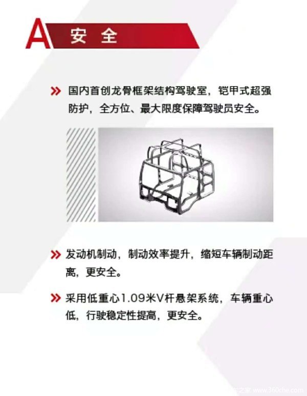 安全 龙骨框架驾驶室,铠甲式超强防护。盘式制动器 抗热衰退性好,机械制动效能和稳定性提升,缩短制动距离,提升主动安全性。