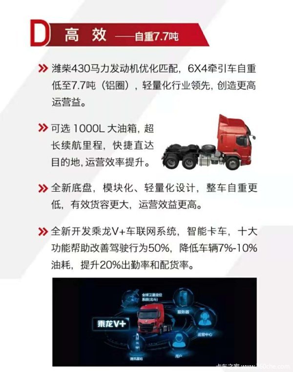 高效 潍柴430马力发动机优化匹配,6X4牵引车自重低至7.7吨,轻量化行业领先,创造更高运营益。