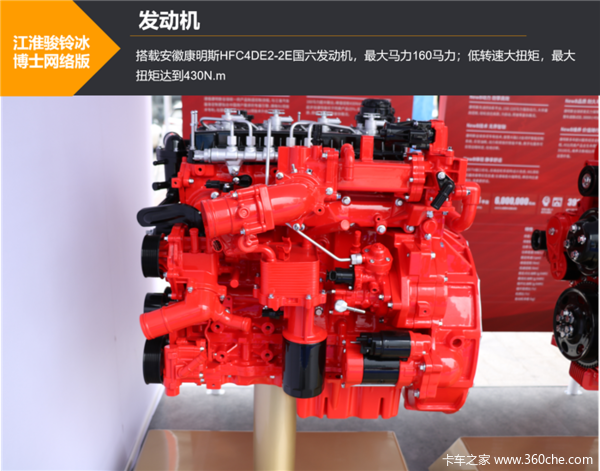 “冰博士”搭载安徽康明斯HFC4DE2-2E发动机,160马力超大输出,满足国六排放;低转速大扭矩,最大扭矩达到430N.m,起步加速性能优于同类产品15%。该车扭矩宽广,轻松适应高原、爬坡、冷启动等复杂路况。