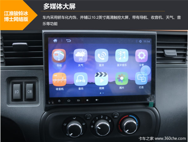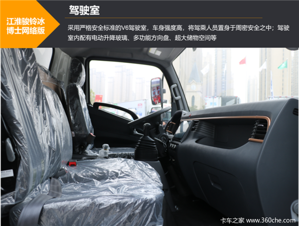 “冰博士”采用严格安全标准的V6驾驶室,车身强度高,将驾乘人员置身于周密安全之中,为安全行车保驾护航;驾驶室内配有电动升降玻璃、多功能方向盘、电加热后视镜等,让驾驶员的驾驶更舒适、更方便快捷;并且,该车还配置车联网系统、倒车影像、多媒体娱乐系统等功能,提高了驾驶员的用车体验。