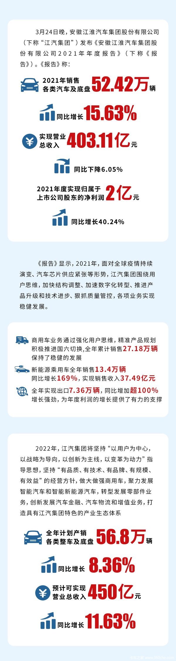 当前位置: 卡车之家 >卡车经销商 > 湖北江淮汽车销售服务有限责任公司 > 促销新闻 > 江汽集团2021年净利润同比增长40.24%
