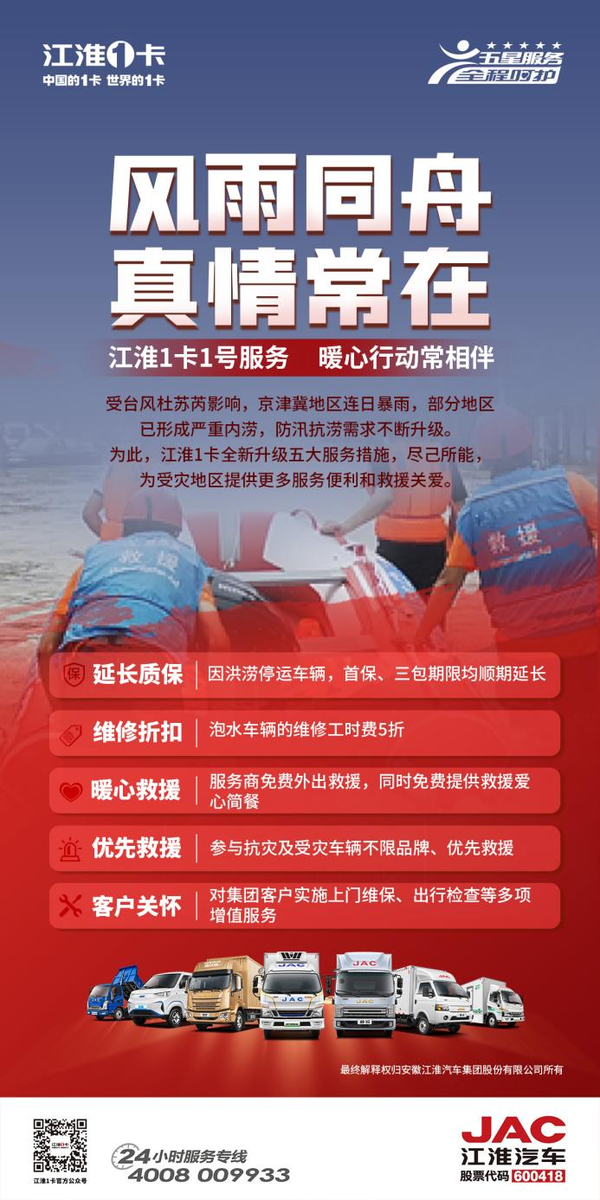 连日来,江淮1卡京津冀区域所有服务站紧急行动,保障卡友安全出行。为进一步保障用户权益,江淮1卡全新升级五大服务措施,尽己所能,提供更多服务便利和救援关爱。