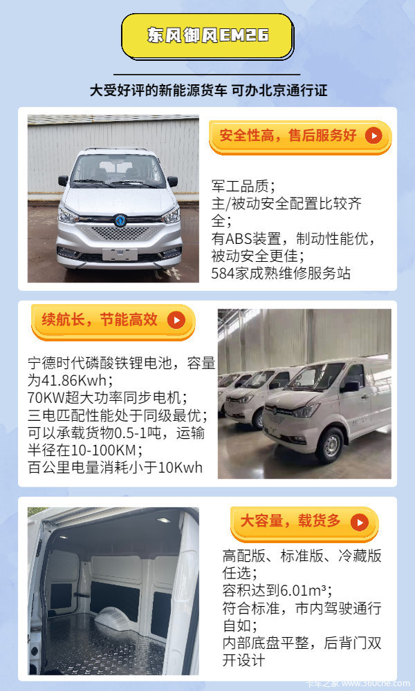 Hello,京津冀的卡友大家好,今天为您介绍一辆非常优秀的新能源封闭式货车,那就是东风EM26,目前这款车店内有现货,并且可以为卡友提供购车分期,保险上京牌,还可以办理城区和市区的通行证~