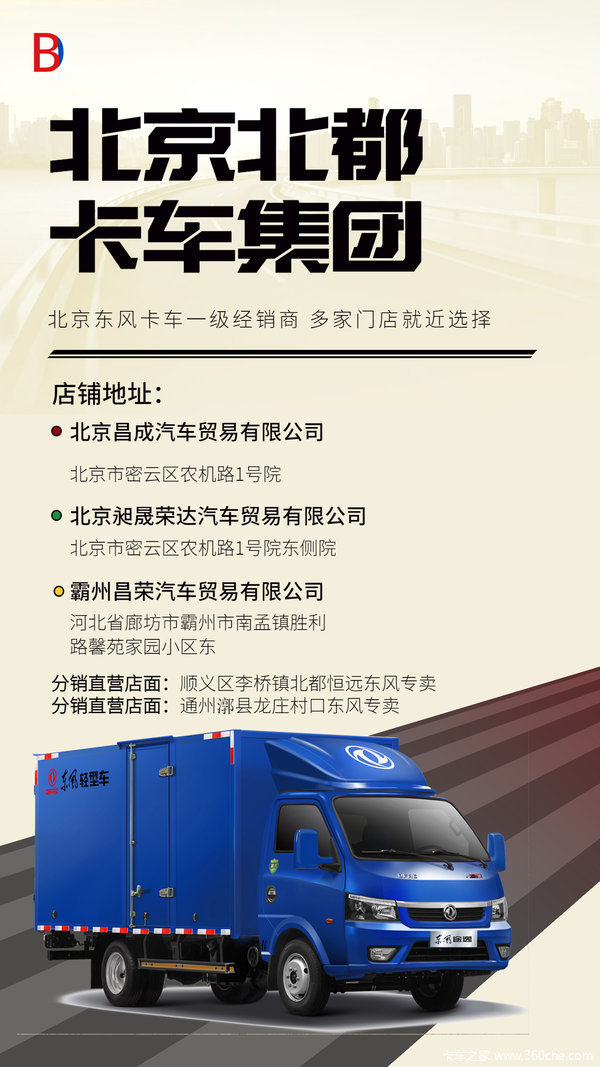 北京北都卡车集团与2003年成立,是东风轻型卡车北京地区一级东风经销商,辐射范围广泛,京津冀地区皆可提车