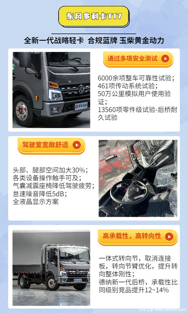 T17经过了多项实验,不仅安全可靠,驾驶体验上也很舒适,全维性能升级实现高效运输,货箱升级2.3米升级为2.43米,整车降重510kg,动力性提升12%,油耗降低10%,耐久性提升30%,可靠性提升50%~