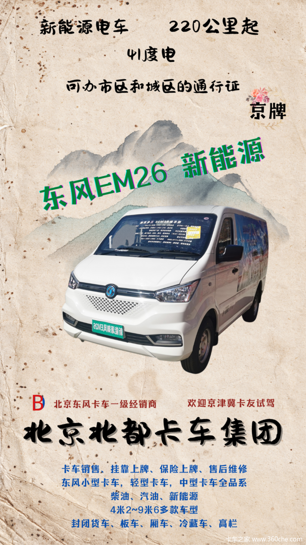 Hello,京津冀的卡友大家好,今天为您介绍一辆非常优秀的新能源封闭式货车,那就是东风EM26,目前这款车店内有现货,并且可以为卡友提供购车分期,保险上京牌,还可以办理城区和市区的通行证~