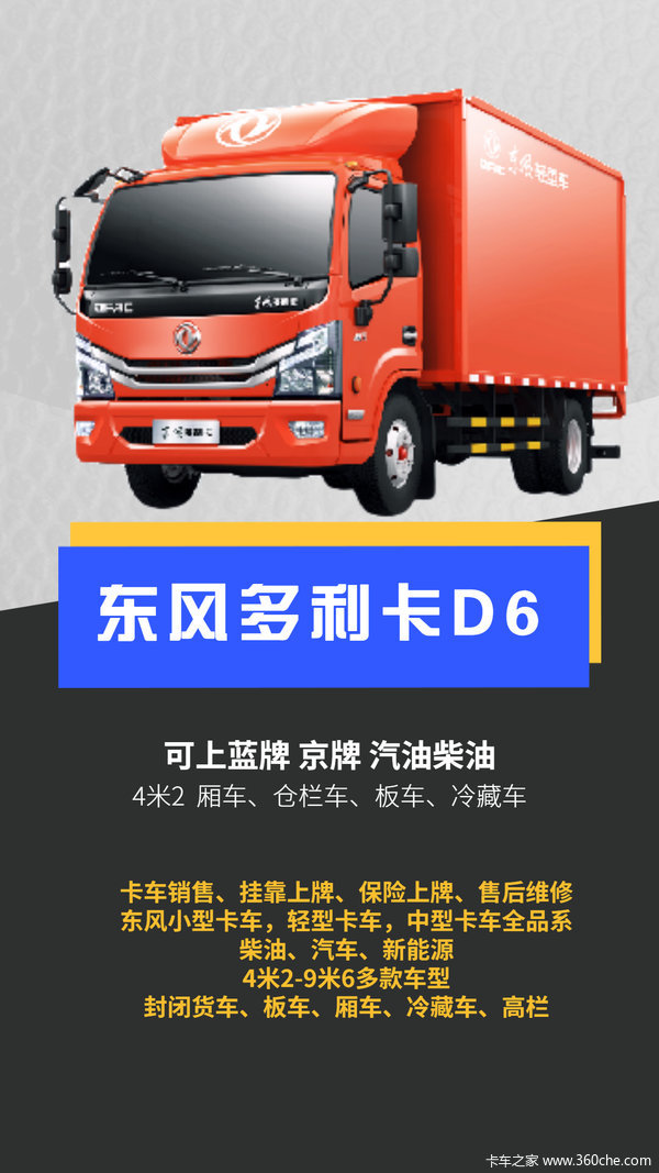 Hello,京津冀的卡友大家好,今天为您介绍一辆非常优秀的轻卡,那就是东风D6重载版 ,目前这款车店内有现货,并且可以为卡友提供购车分期,保险上京牌,蓝牌~
