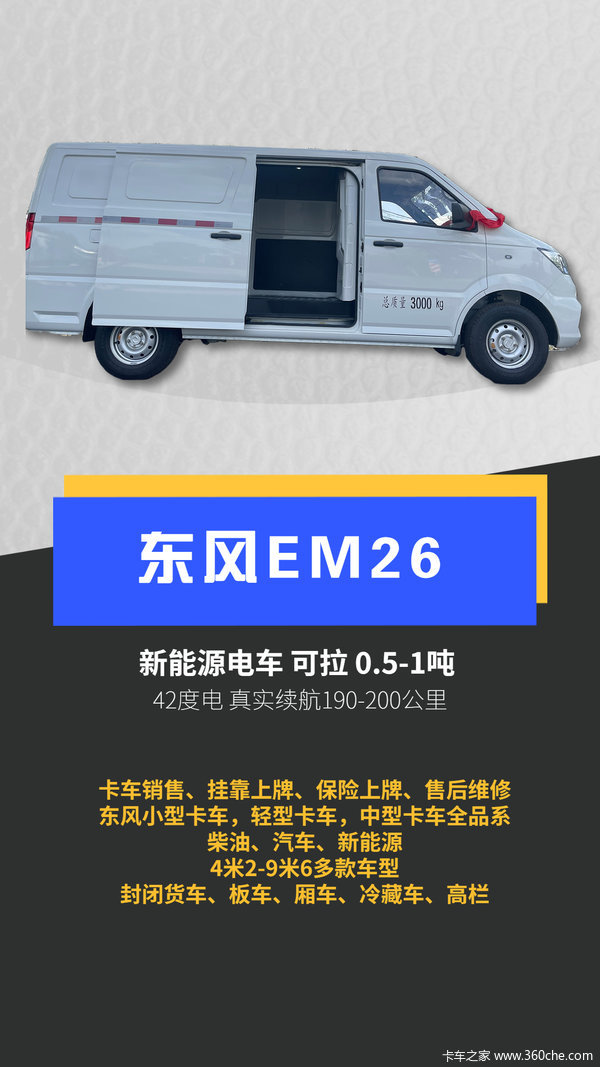 Hello,京津冀的卡友大家好,今天为您介绍一辆非常优秀的新能源封闭式货车,那就是东风EM26,目前这款车店内有现货,并且可以为卡友提供购车分期,保险上京牌,还可以办理城区和市区的通行证~