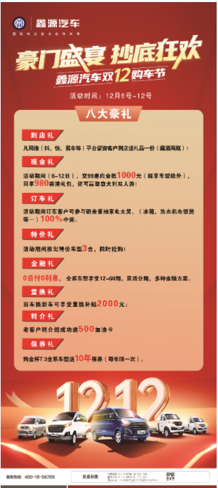 当前位置: 卡车之家 >卡车经销商 > 武威林胜(SRM鑫源) > 促销新闻 > 豪门盛宴,抄底狂欢,鑫源汽车双12购车节