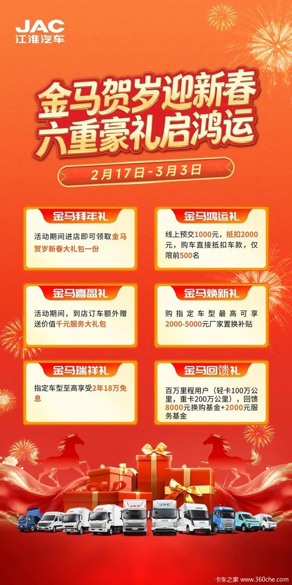 当前位置: 卡车之家 >卡车经销商 > 苏州盛奥汽车(江淮新能源) > 促销新闻 > 金马贺岁迎新春 六重豪礼启鸿运---JAC