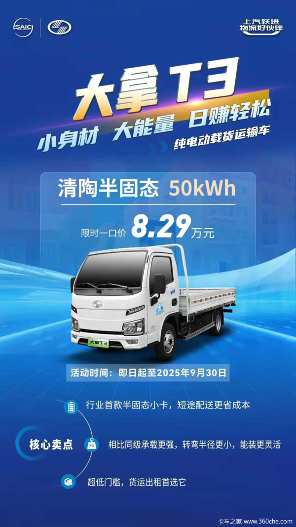 当前位置: 卡车之家 >卡车经销商 > 重庆上汽轻卡汽车销售服务(厂家直营店) > 促销新闻 > 大拿T3清陶半固态50kwh 限时一口价