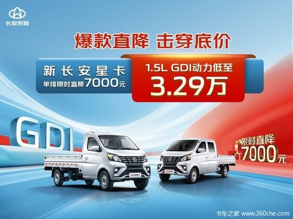 每逢年底,百业开启促销狂欢,长安凯程为回馈广大用户朋友的关注和信赖,推出新长安星卡现金直降促销政策。拿出100%的诚意,针对旗下的明星车型——新长安星卡,推出直降7000元优惠政策,把1.5L GDI动力价格打到最低3.29万元,以“超低尖叫价”,真正让利给用户,无套路为用户创富降低成本。