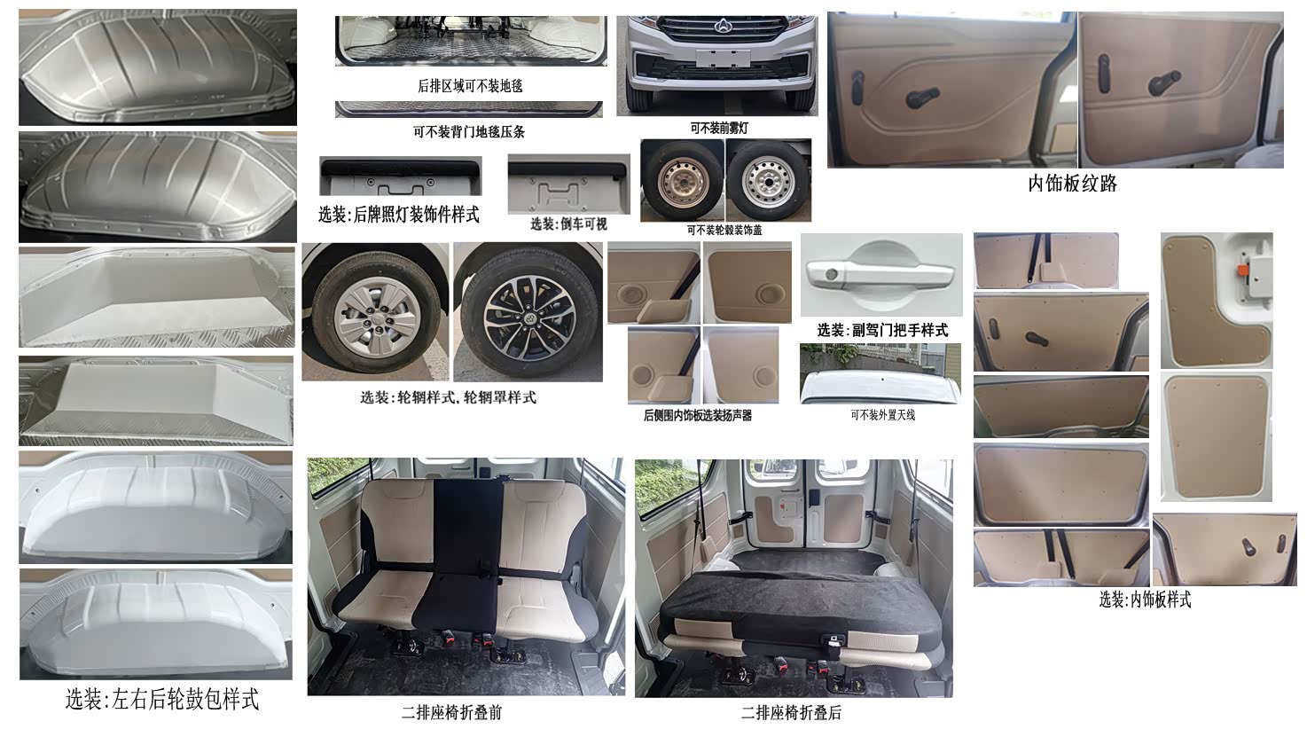选装部件包括空调、电动门窗、中控锁、MP5、倒车可视、内饰板纹路、轮辋罩样式、轮辋样式、后牌照灯装饰件样式、左右后轮鼓包样式、副驾门把手样式、内饰板样式、后侧围内饰板选装扬声器、可不装前雾灯、可不装轮毂装饰盖、可不带备胎、后排区域可不装地毯、可不装背门地毯压条、可不装外置天线。该车型可选装直接供电式ETC车载装置,配备汽车事件数据记录系统(EDR)。