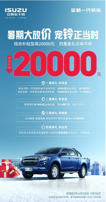 随着2024年悄然过半,或许你会思考自己年初定下的目标完成了多少。无论是期待一次酣畅的草原之旅,还是希望在本年度实现一定的财富积累,又或是计划购买一辆商乘两用的皮卡以满足工作和生活需求,每一步都充满了对美好生活的向往和追求。为了助力更多用户实现他们的愿望,江西五十铃在这个夏季特别推出了全新一代铃拓专属特惠活动——“暑期大放‘价’,宠‘铃’正当时”购车节,即日起用户购买全新一代铃拓,即可享受至高20000元的综合补贴。这不仅是一次购车的好时机,更是一次实现梦想的契机。宜家宜商全能皮卡四重豪礼乐享不停江西五十铃旗下有三大产品线,D-MAX和瑞迈分别定位于“全球顶流皮卡”和“创富精工大皮卡”,全新一代铃拓则是介乎两者之间的集大成者,传承了D-MAX全部技术的高端乘用皮卡,更具备了瑞迈超值的性价比。换言之,全新一代铃拓不仅能够满足用户工作之需,也能满足用户生活之需,可谓商乘两用,是不可多得的全能皮卡不二之选。无论你是想开启一次草原之旅,还是寻找一个靠谱创富伙伴,全新一代铃拓都能轻松胜任。