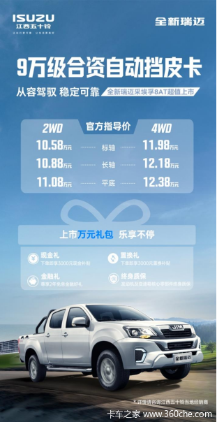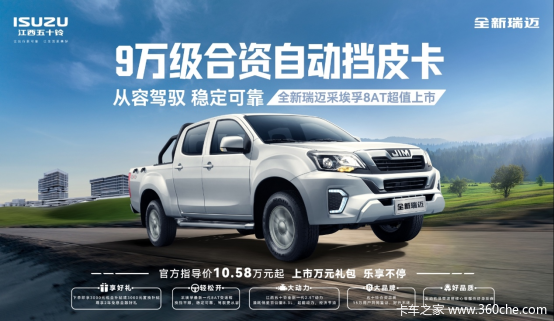 9万级的超值价格,出色的动力性能、卓越的驾控感、全维安全防护以及精工品质,全新瑞迈8AT将让每一位车主拥有从容创富的底气。新车现已正式上市,即刻购车还可享受多重购车礼遇,以更低价格轻松开回爱车!未来,江西五十铃将继续以卓越品质回馈用户,与用户携手共享更加美好的皮卡生活。