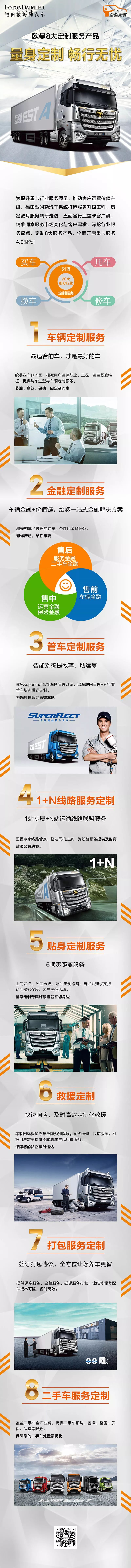 福田戴姆勒汽车提供全生命周期的定制化服务产品,形成卡车定制服务闭环管理,通过车辆定制、金融定制、管车定制、1+N线路管家服务、贴身服务定制、救援定制、打包服务定制、二手车定制服务8大VIP定制服务,为车辆的全生命周期提供更大的价值,帮助运输企业和个人实现更高盈利。