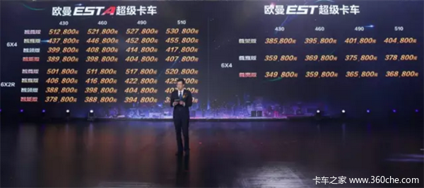 欧曼EST-A超级卡车分为智能版、智领版、智享版、智尊版四款产品,价格区间为35.58-52.78万元;欧曼EST超级卡车分为尊贵版、尊享版、尊荣版三款产品,价格区间为30.58-40.18万元
