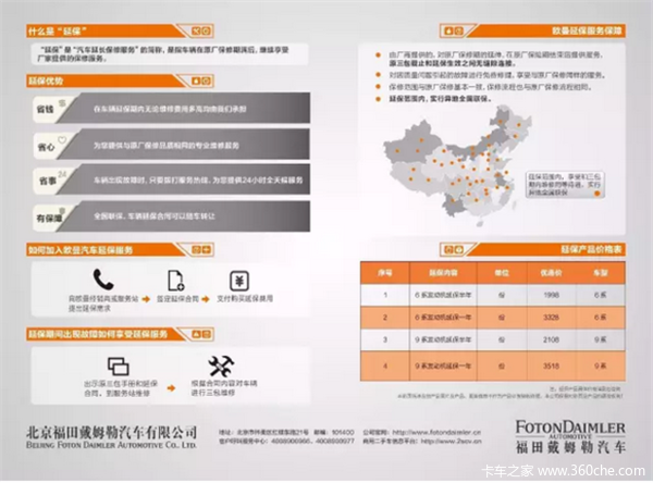 用户所购买的福田戴姆勒全系牵引车,均可以购买延长保修服务,延保时长包括6个月和12个月两种。增加延保服务后,整车保修时长从原本的3年延长到3.5年或4年,保修服务不限公里数。