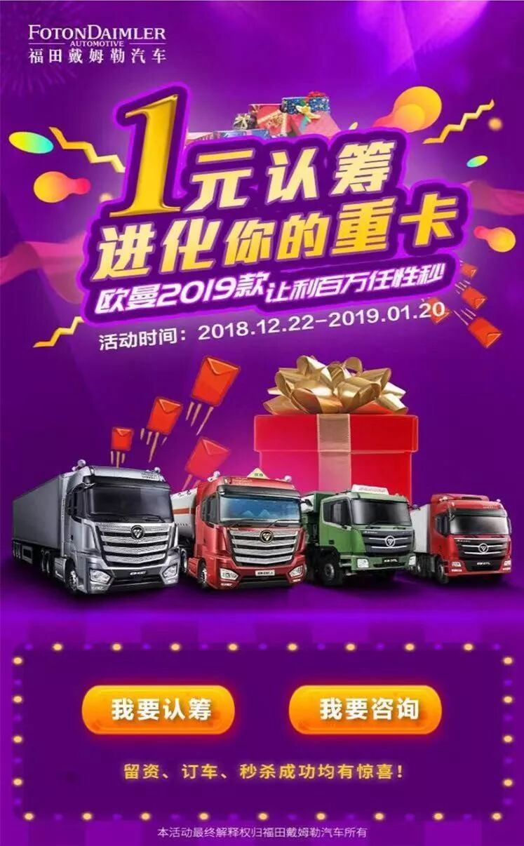 “1元认筹”秒杀让利百万任性活动只需支付1元,即可获得四次参与欧曼超级重卡2019款的秒杀机会;