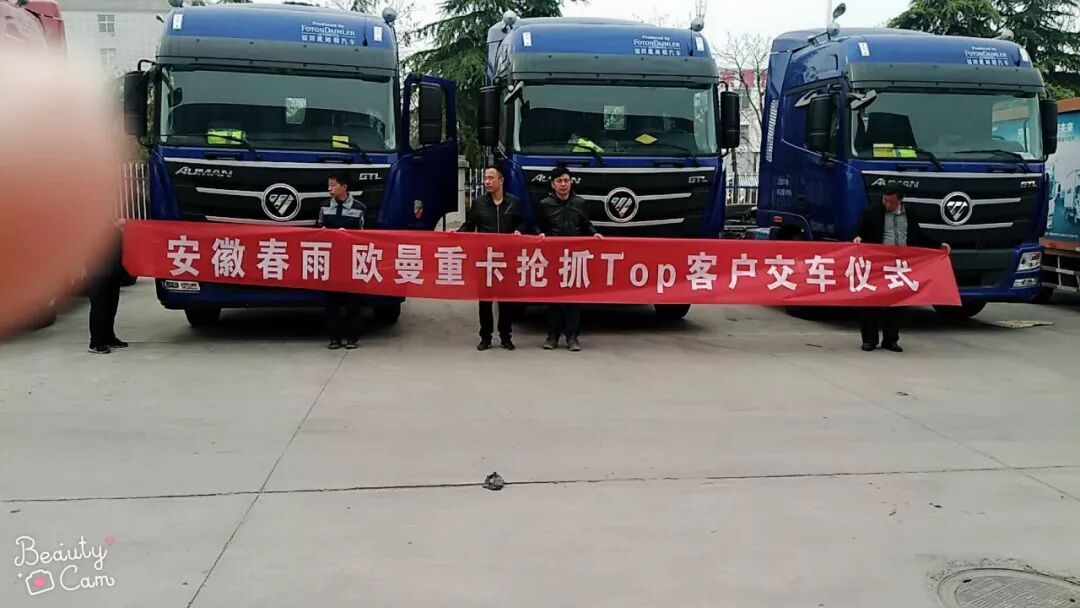 安徽春雨 | 欧曼牵引车交车仪式现场。通过交车仪式,也让意向客户更加了解欧曼。春天,新的开始,当然需要有欧曼陪着你一起奋斗。