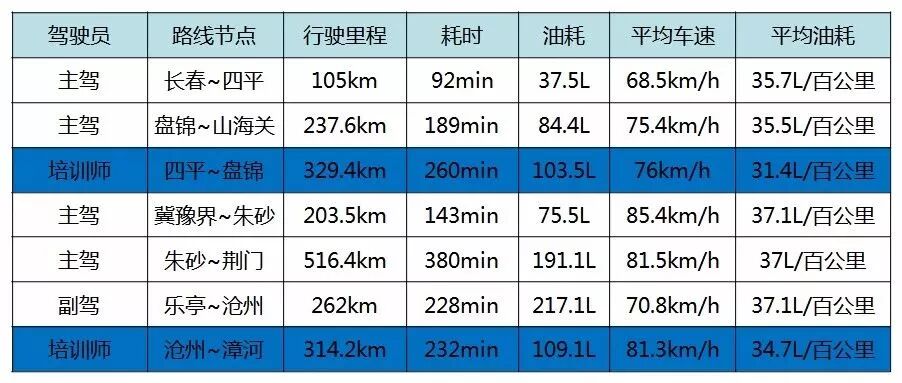 这次跟车路线是长春到荆门路段,总里程2115Km。我们先看看这一路段主副驾驶员和培训师驾驶的油耗表现。