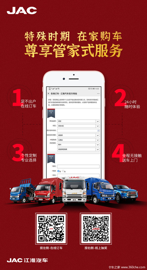 当前位置: 卡车之家 >卡车经销商 > 甘肃昊威汽车销售 > 促销新闻 > 江 淮 骏 铃 线 上 订 车 渠 道 全 面 开 启