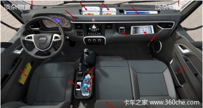很多客户会抱怨,卡车驾驶室空间局促,拉货的一些单据,高速的通行卡等无处可放,容易弄丢。骏铃V系充分解决卡友这一烦恼,由海外研发中心设计,样式新颖美观,集轿车化和功能性于一体,储物空间多达16处,让你处理杂物,举手之劳。