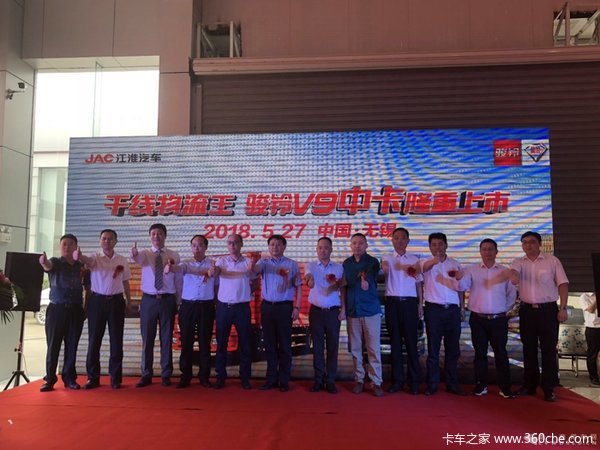 5月27日,江淮汽车在江苏无锡隆重举行江淮骏铃V9中卡新车上市发布会,宣布V9中卡全国上市。江淮轻型商用车营销公司副总经理张先华,江淮骏铃营销公司副总经理韦正宪,江淮骏铃营销公司销售管理部部长刘伍,江淮骏铃营销公司相关人员,云内动力负责人,江淮骏铃无锡地区经销商无锡盛田董事长唐英杰,江淮骏铃安徽、江苏、浙江、上海等地经销商代表,江淮轻卡江苏地区用户代表,以及第一商用车网等媒体代表见证了此次上市活动。