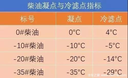4. 使用油箱加热器。在高寒地区,停在室外的车辆油箱很容易上冻,一旦柴油结蜡的话就意味着车辆将无法正常启动。这时便可使用油箱加热器来解决油箱上冻的问题,比起用喷灯给油箱加热更加安全可靠。此外,还要注意选择合适标号的柴油,具体参照下表: