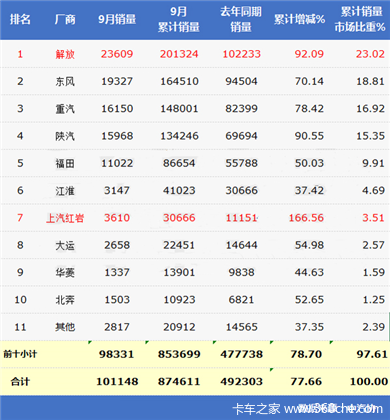 根据中汽协发布数据,9月,全国卡车产销32.30万辆和31.93万辆,同比增长26.32%和26.82%。其中,重卡销量10.11万辆,同比上涨91%;中卡销量2.27万辆,同比上涨12.55%。而1-9月,重型货车产销86.14万辆和87.46万辆,同比增长76.91%和77.66%。中型货车产销17.69万辆和17.44万辆,同比增长12.48%和9.73%。纵观几十年来的重卡销量记录上,本次9月份的销量是同期历史最高的,冲破10万大关。