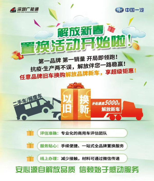 当前位置: 卡车之家 >卡车经销商 > 深圳广能通供应链 > 促销新闻 > 解放新春置换活动开始啦,以旧换新尽在广能通!