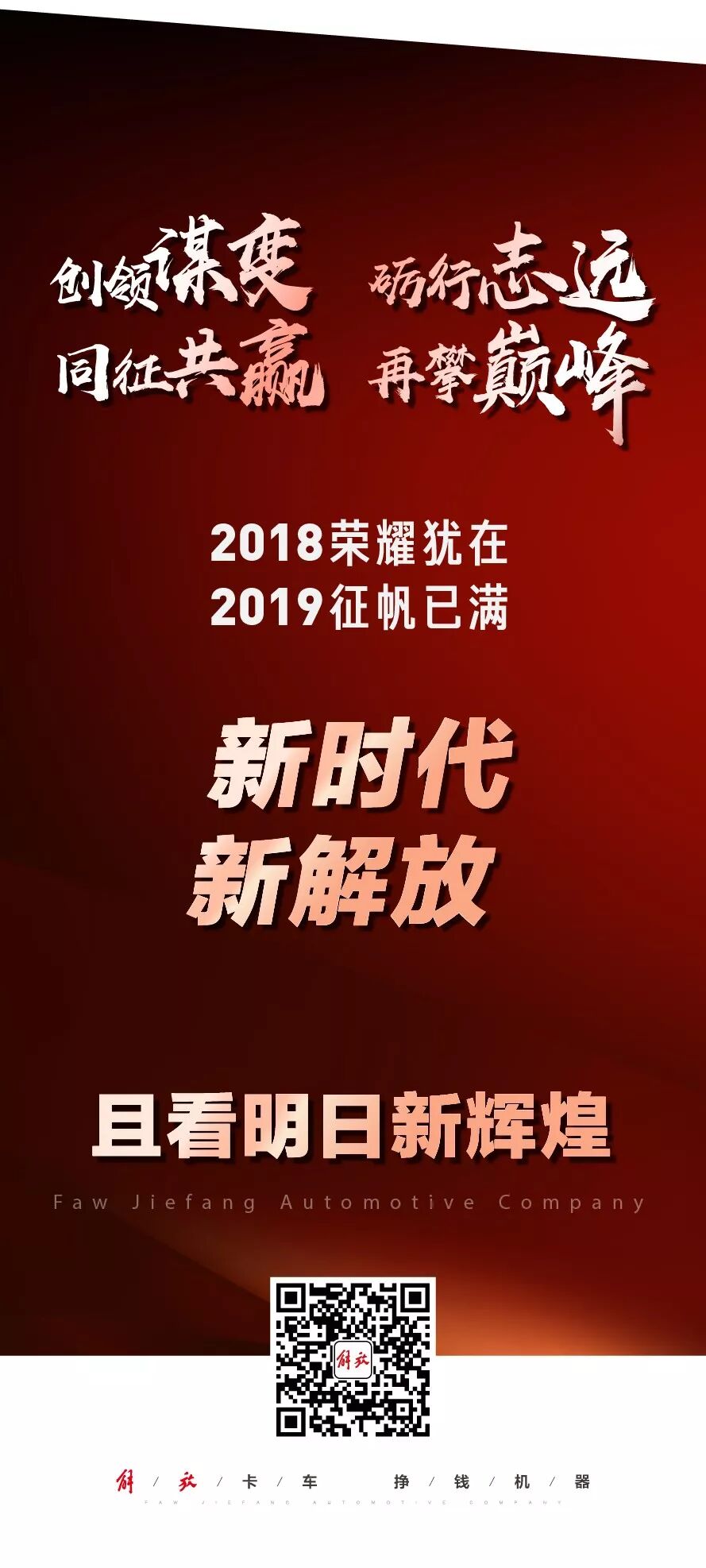 2018年,一汽解放全新品牌战略发布,未来,解放将通过企业品牌、技术品牌、产品品牌、服务品牌、公益品牌、生态品牌的持续建设,践行“信而有征 智勇双全 益行天下”全新品牌理念,打造中国最值得骄傲的商用车企业、最值得信赖的商用车品牌。