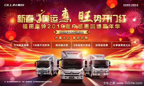 福田奥铃已经准备好了最心动的福利优惠,让用户买到最具性价比的轻卡;准备好了品质可靠的全系产品,让用户用到最适合自己的车;同时也准备好了全程无忧的售后服务,让用户放心用车。做好了一切准备,本次福田奥铃“新春奥运惠,旺势开门红”促销活动恰如东风,让福田奥铃在2019领军开局的首战便大获全胜。为让更多新老用户享受到实惠,福田奥铃的福利仍在持续!在3月1日至4月30日,福田奥铃开展“汽车下乡选奥铃,惠民补贴千万家”的春季促销活动,准备了“换购礼、购车礼、幸运礼、荐购礼、关怀礼”等五重豪礼!惊喜多多,为你而来。