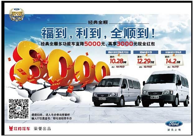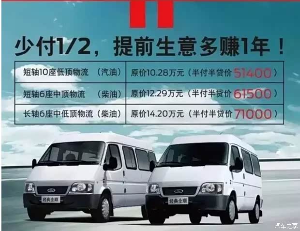 你也可选择20%首付的方式分期贷款。首付20%的车款购得全顺,月供,全年免息。