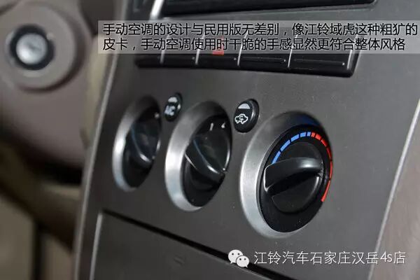 手动空调的设计与民用版车型相同,像江铃域虎这种粗犷的皮卡,手动空调使用时干脆的手感显然更符合整体风格,所以也并没有什么不合适的。